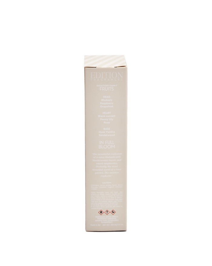 - Perfumy do wnętrz o pojemności 100 ml. Francuska kompozycja zapachowa złożona z wielu nut na bazie naturalnych olejków o wysokim stężeniu na poziomie eau de parfum. Wysokiej jakości barwione szkło oraz nasadka w czarnym kolorze. Edycja In Full Bloom to soczyste nuty rabarbaru i czerwonych owoców na subtelnych płatkach róży otoczonych piżmem i delikatną wanilią. Nie mogą być stosowane jako perfumy do ciała.