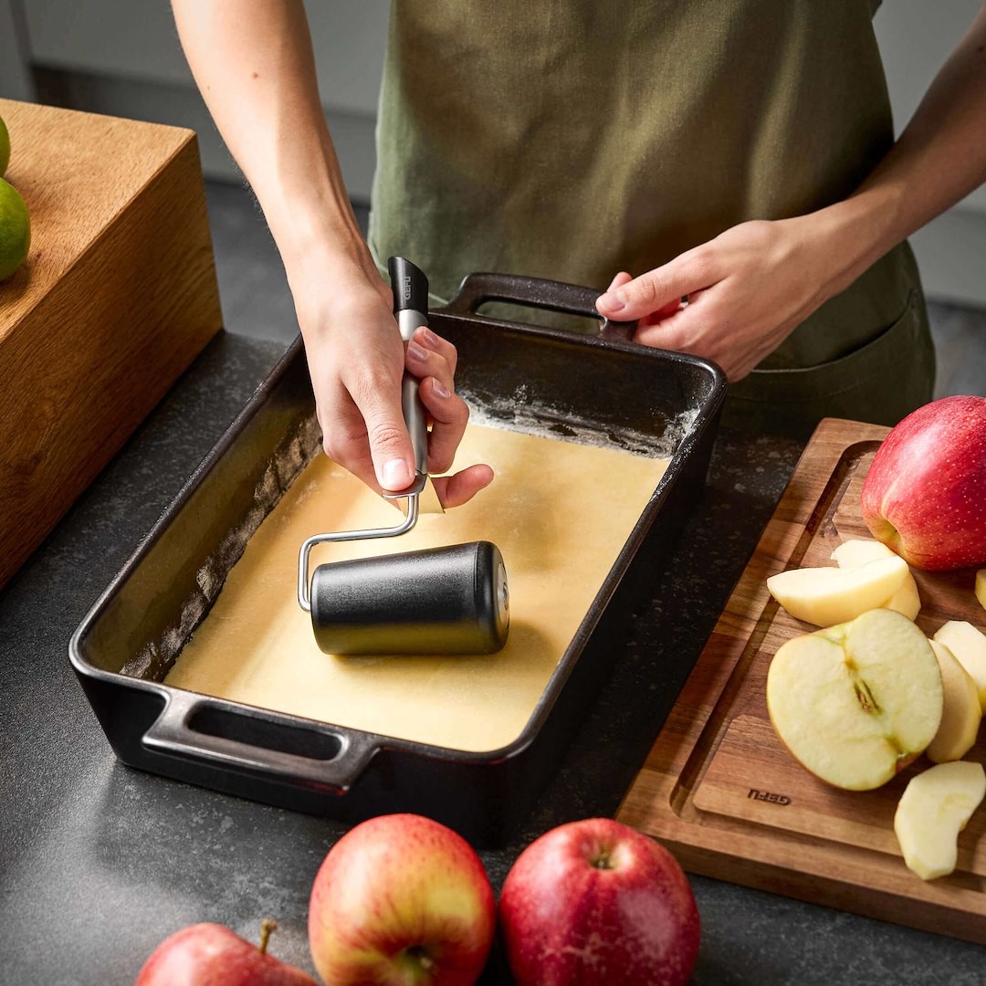 Do precyzyjnego rozwałkowywania ciasta w okrągłych formach do pieczenia lub aż po same rogi prostokątnych blach. Doskonale sprawdzi się przy przygotowywaniu ciast na blasze, pysznych tart, ulubionych pizz i wielu innych wypieków!