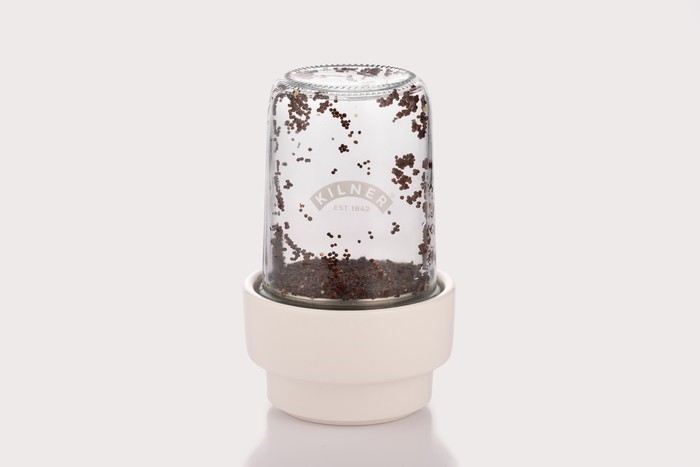 - 3. Kiełkowanie: Wymieszaj delikatnie nasiona, a następnie ustaw słoik na ceramicznej podstawce pod lekkim kątem, aby zapewnić odpływ nadmiaru wody i cyrkulację powietrza. Płucz i odcedzaj nasiona 2–3 razy dziennie, każdorazowo dokładnie je odsączając.