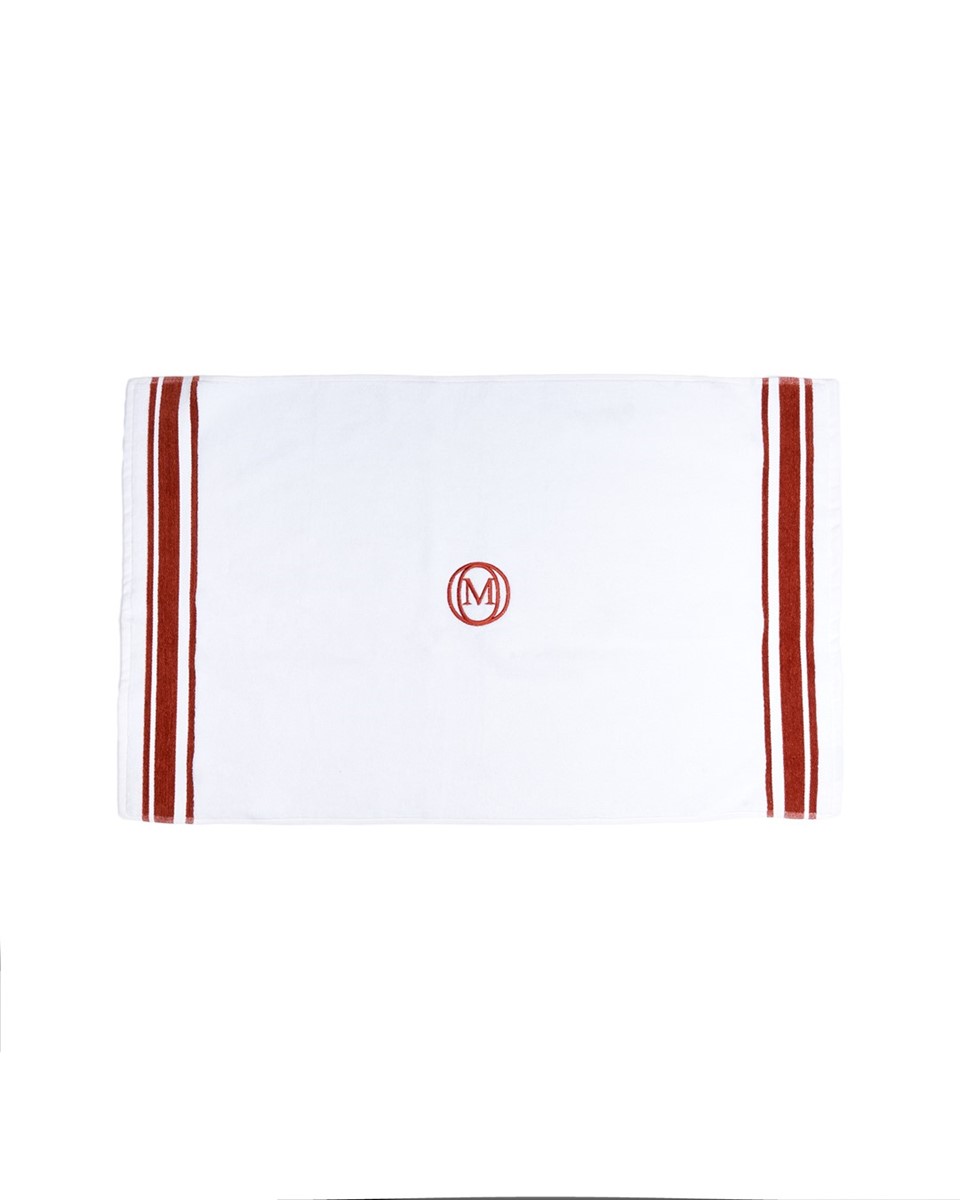 - Dywanik łazienkowy z białej organicznej bawełny frotte z żakardowymi kolorowymi paskami w aksamitnym splocie chenille. Bawełna odwójnie czesana, wstępnie prana. Dywanik posiada podwójne przeszycia w tym samym kolorze i zamknięte rogi.