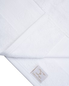 - Ręcznik duży kąpielowy z białej organicznej bawełny frotte z żakardowymi białymi paskami w aksamitnym splocie chenille. Bawełna odwójnie czesana, wstępnie prana. Ręcznik posiada wszytą pętelkę do zawieszania w tym samym kolorze, podwójne przeszycia i zamknięte rogi.