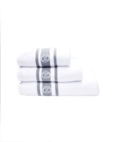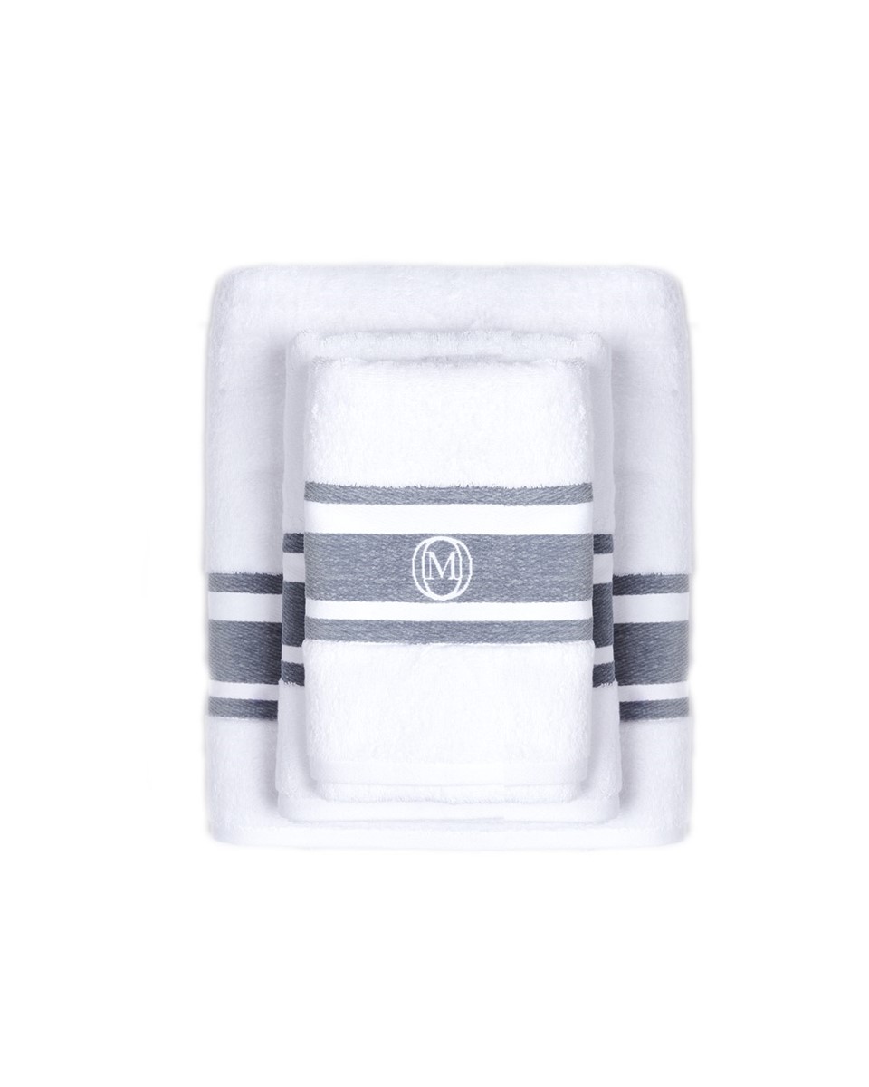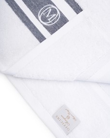 - Ręcznik duży kąpielowy z białej organicznej bawełny frotte z żakardowymi kolorowymi paskami w aksamitnym splocie chenille. Bawełna odwójnie czesana, wstępnie prana. Ręcznik posiada wszytą pętelkę do zawieszania w tym samym kolorze, podwójne przeszycia i zamknięte rogi.