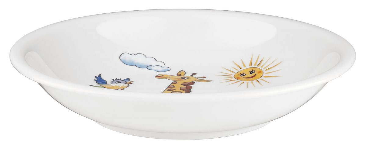 Talerz do zupy Colorful Wildlife zachwyca barwnym wzorem inspirowanym naturą. Głównymi elementami dekoracji są słońce, żyrafa i ptaki, które tworzą harmonijną i radosną kompozycję. Ilustracja w ciepłych, przyjaznych kolorach przywołuje atmosferę egzotycznej sawanny, dodając posiłkom wyjątkowego uroku.