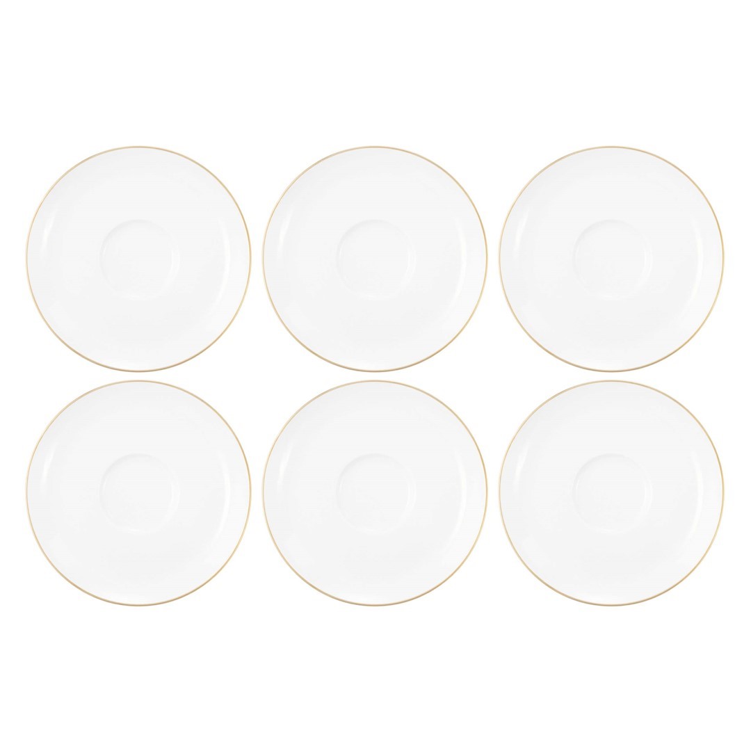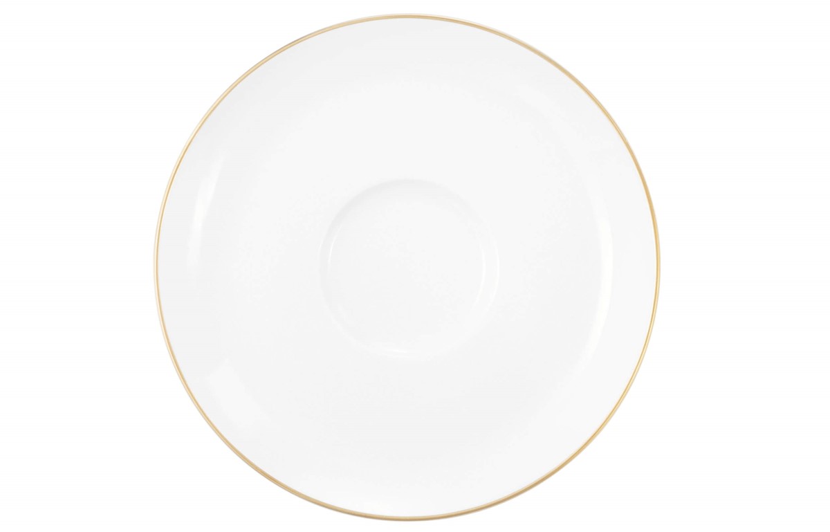 Biała porcelana, zwieńczona delikatnym złotym obramowaniem, nadaje naczyniu klasyczny i wyrafinowany wygląd. Dzięki najwyższej jakości porcelanie spodek jest trwały, a jego wyprofilowanie skutecznie chroni powierzchnię stołu przed plamami.